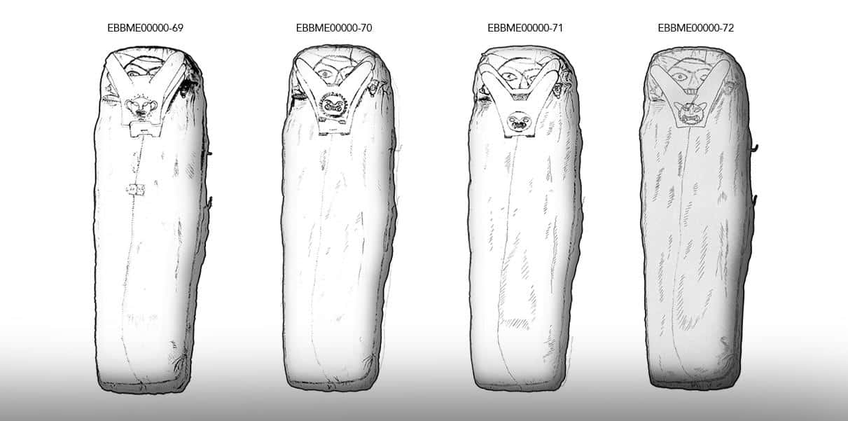 Los ojos almendrados son recurrentes en el diseño central de las diademas de la Señora de Cao, asemejando rasgos felinos y otorgándoles un aspecto feroz. Por otro lado, algunos diseños están acompañados de volutas o de formas onduladas, como en el caso de la pieza EBBME00000-70, alrededor del rostro, o de la pieza EBBME00000-71, sobre la boca (Fernández, 2021).
