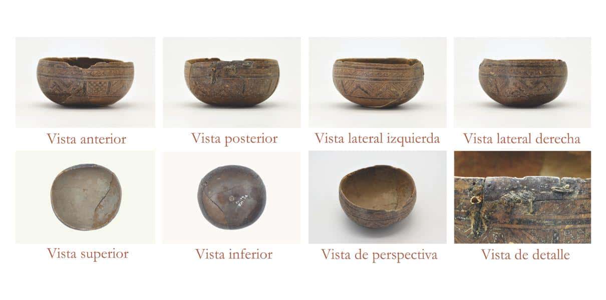 Figura 4. Vistas fotográficas de un cuenco elaborado en mate con diseños geométricos en pirograbados (EBBBT00000-255).