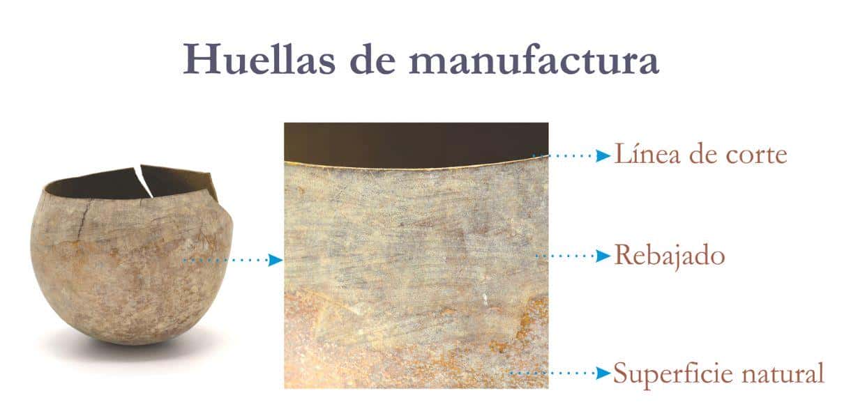 • Huellas de manufactura. Nos permiten evidenciar el trabajo realizado sobre la superficie de la pieza. Estas pueden ser de manera burda como el desbastado en la fabricación de un artefacto de madera o como el corte en los mates para la elaboración de recipientes.