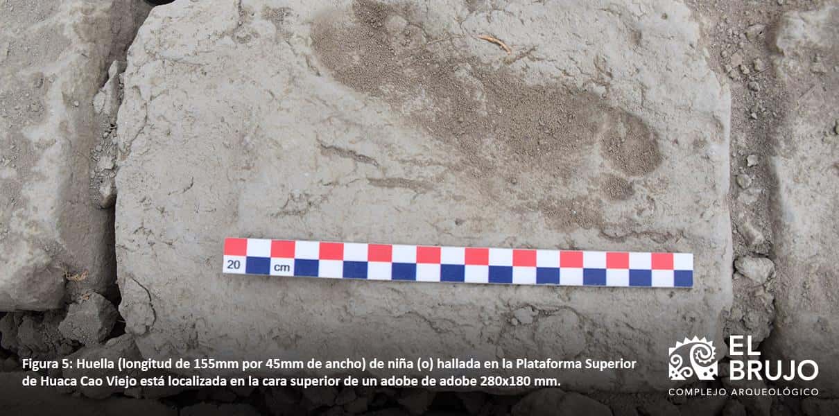 Las huellas de pisadas proporcionan una valiosa información sobre la interpretación entre el trabajo, el juego y el aprendizaje. La presencia de niños durante la confección de los adobes que formaban parte del relleno constructivo en la Plataforma Superior de la Huaca Cao Viejo, entre los años 500- 800 d.C., hace pensar que los niños estarían acompañando a los adultos en sus actividades constructivas, aprendiendo de primera mano las labores necesarias para la construcción arquitectónica, sin salir del cuidado y vigilancia de los padres.
