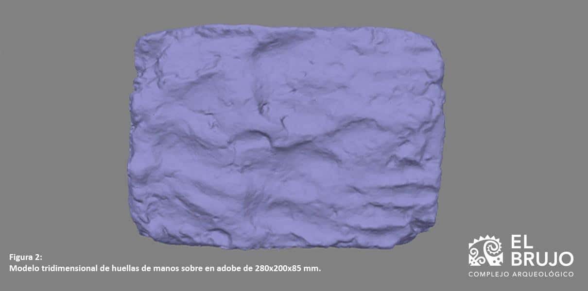 Los adobes encontrados en su gran mayoría tenían impregnados las huellas de manos. Identificamos huellas de una sola mano, dos huellas de manos estáticas (derecha e izquierda) y manos en posición de arrastre. En menor cantidad hallamos huellas de pies.