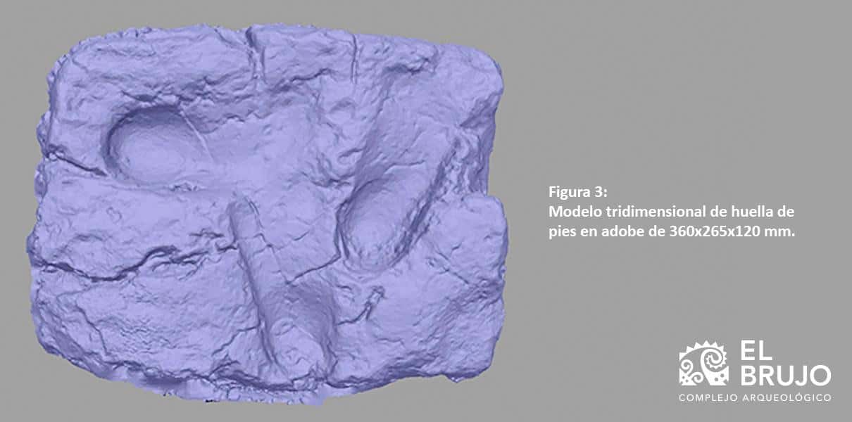 Adicionalmente, los estudios de Verano (1997:318) sobre los esqueletos moche fueron básicos en la investigación. Verano plantea que la talla de una mujer promedio moche era de 146.8 cm y la de un hombre de 157.6 cm. Con estos datos fue más fácil diferenciar la huella de un hombre y una mujer /niños(a) a partir de la talla, aunque no la diferencia de estos últimos. Con las medidas de longitud y ancho de las pisadas fue posible identificar una huella que corresponde a un niño(a).