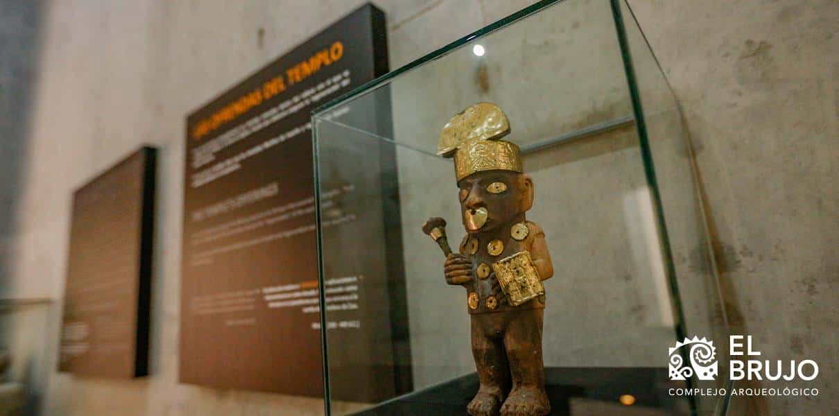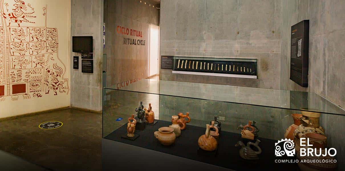En la primera sala destaca un panel de presentación titulado “Todas las aguas”, en él podemos apreciar la línea cronológica de los pobladores que habitaron este lugar y lugares aledaños a lo que es hoy el Complejo Arqueológico El Brujo y sus 3 emblemáticas huacas, 5000 años de historia y cultura.