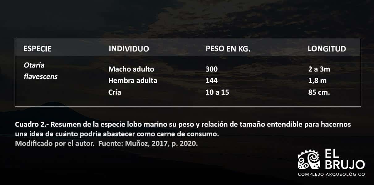Al parecer, los productos consumidos, con mayor concentración cárnica y proteica vino del mar y de la tierra. Lo que nos da una idea de la complementariedad económica ya que hemos encontrado restos óseos fragmentados de lobos marinos (Otaria flavescens) dentro de los adobes. De acuerdo a Muñoz (2017) estos mamíferos aportan una gran cantidad de carne: el macho adulto pesa 300 kg. (largo de 2 a 3 m.), la hembra adulta pesa entre 144 kg. (largo de 1,8 m.) y una cría de 10 a 15 kg. (largo de 85 cm.), demostrando ser una fuente energética y sustento para poblaciones humanas del litoral.