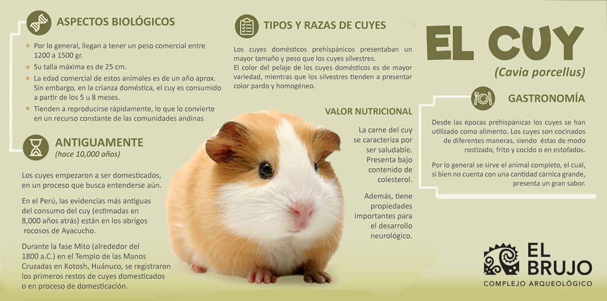 En el Perú las evidencias más antiguas del consumo del cuy están en los abrigos rocosos de Ayacucho. Alrededor del año 8000 a.C., los antiguos pobladores andinos atrapaban estos animales por medio de trampas y los mantenían encerrados en casilleros (León 2013: 322). Es durante la fase Mito (alrededor del 1800 a.C.) en el Templo de las Manos Cruzadas en Kotosh, Huánuco, donde encontramos restos de cuyes domesticados o en proceso de domesticación (Wing, 1972). Estos animales provendrían de varios tipos de cuyes silvestres, dependiendo del área geográfica, probablemente de Cavia aparea (Rodd, 1972) o Cavia tschudii (Wing, 1986; Walker, L. I. et. al., 2014) por ser las especies más cercanas genéticamente.