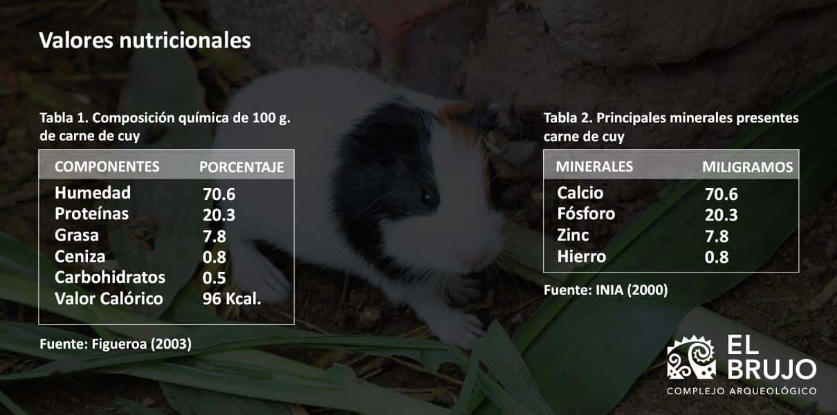 El cuy se caracteriza por ser una carne saludable, altamente digestible, bajo en sodio y presenta bajos contenidos de colesterol. Además, es una fuente importante de Vitamina B y ácidos grasos linoleicos y linolénicos, importantes para el desarrollo neurológico.