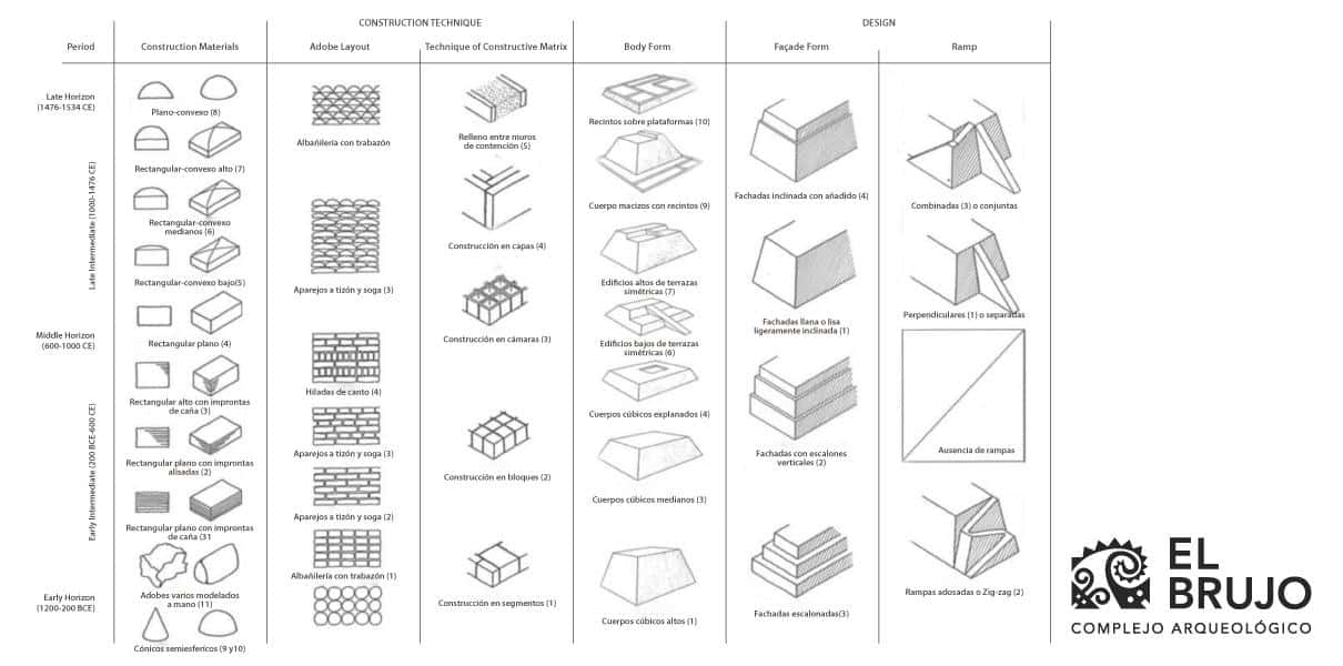 Figure 4. An example of the changes detected in the constructive elements and monumental architecture of the North Coast, created by Marcus Reindel in early 1990. Over a range of almost 3,000 years, it identifies the changes that occurred in the shapes of adobes, the way in which these were place in constructions, the type of public architecture built and its facades, as well as the changes or diverse types of ramps used to access the monuments. (Reindel 1993:368).