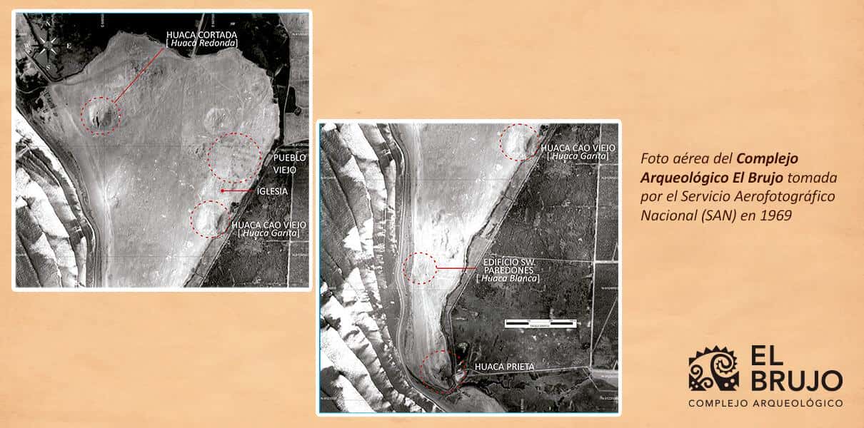 Aerial photo of the El Brujo Archaeological Complex taken by the National Aerphotographic Service (SAN) in 1969. The names in capital letters are those used today, while those in square brackets are those recorded by Antonio Raimondi during his visit.