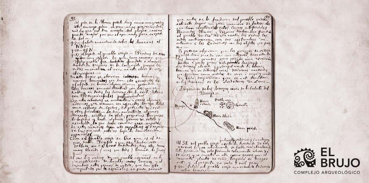 Pages 32 and 33 of A. Raimondi's notebook, where you can read his notes and a sketch of the El Brujo Archaeological Complex. Image: General Archive of the Nation.
