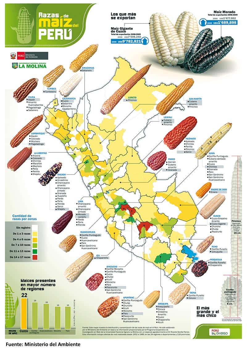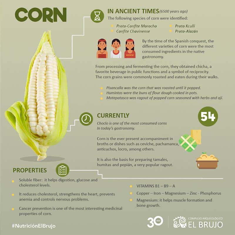 Corn is the native cereal of the American continent. With the Spanish colonization and the globalization of the economies, corn was taken to every corner of the world and integrated progressively into the diet in China, India and the countries of Europe. In the following lines, we shall review rapidly the history of corn in Peru, its consumption in Peruvian cuisine and its nutritional values.